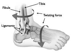 Ротационные силы воздействующие на стопу приводят к перелому в области лодыжки или растяжению или разрыву связок, повреждению суставной сумки.