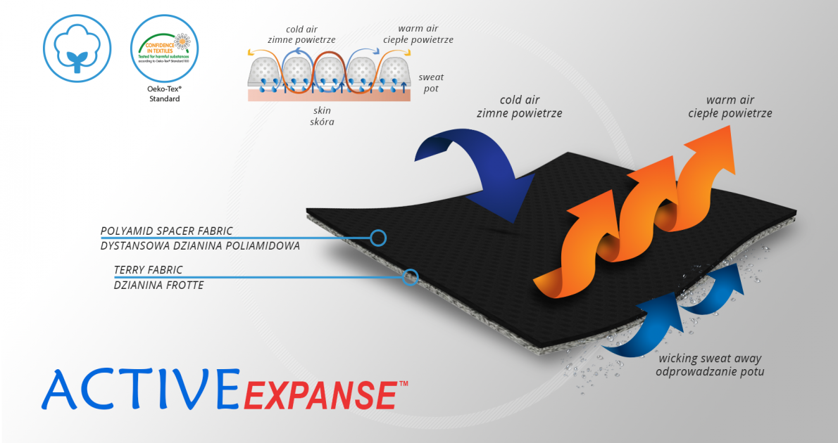 ActiveExpanse™ is an innovative, active 3D lamination with high air permeability. This spacer material is light made of 2 parts: external polyamide durable 3D layer and skin-friendly cotton layer with Oeko-Tex Standard 100 certificate. ActivExpanse™ is not elastic what improves stabilization. External 3D spacer layer is hypoallergenic and provides high air permeability and minimal water and moisture absorption. Our medical devices made of this fabric are very comfortable.
