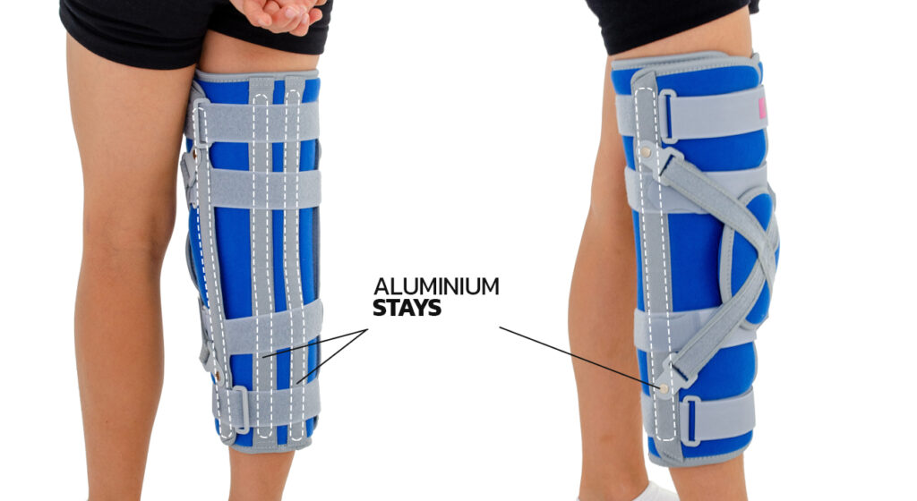 Knee immobilizer AM-TU-DK-02 with kneecap maintains the knee in the extension. 3 anatomically contoured aluminum splints stabilize leg perfectly. Additional knee support controls patellar movement and stabilizes weak and injured knee in upright position.