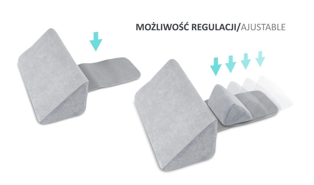 Innovative design based on two differently sized wedges and a wraparound strap. Soft wedges protect the child from uncontrolled movement while lying on the side. The smaller wedge can be freely attached anywhere, so the product “grows” with the child.