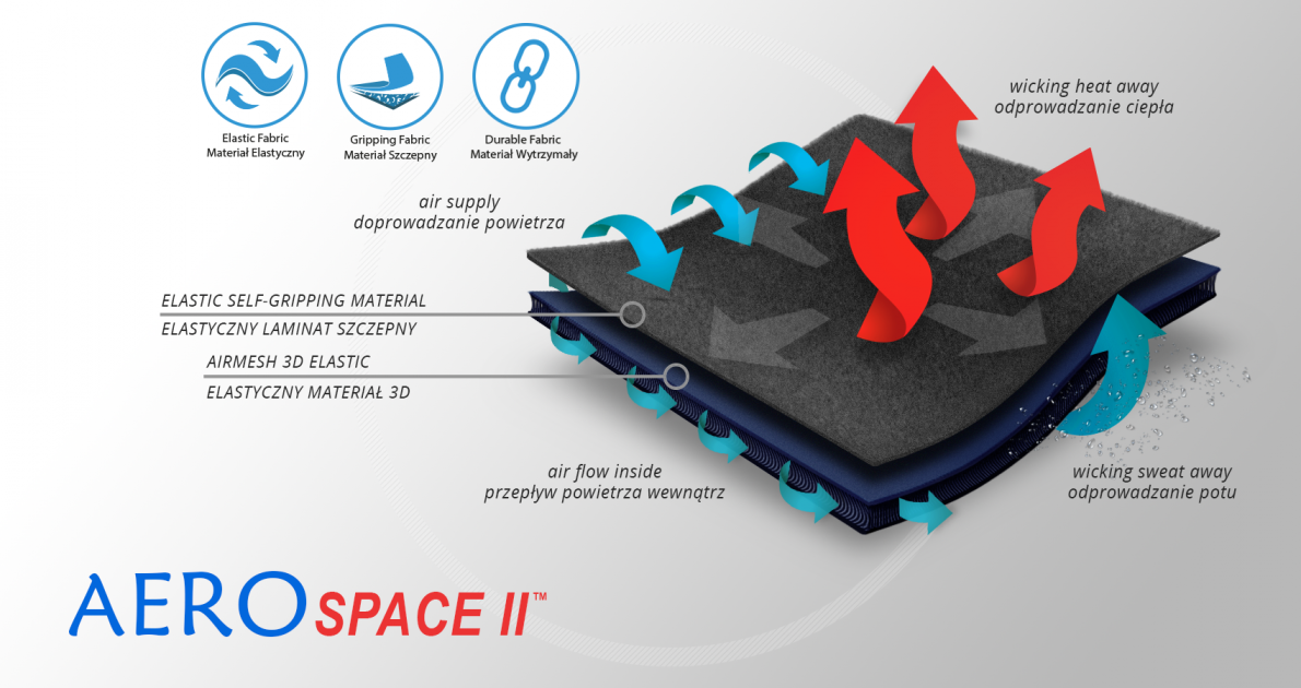 AeroSpace II™ это инновационный материал нового поколения. Представляет собой пространный и эластичный 3D материал, состоящий из двух внешних слоев и плетенной внутренней части создающей нужную толщину и разгружающие свойства. Используется полиэстр обеспечивающий механическую прочность и спандекс обеспечивающий эластичность. Имеет внешний полиамидный слой с функцией самоклеения, что позволяет легко регулировать изделия из этого материала. Это очень легкий, высоко эластичный и ажурный материал, благодаря чему хорошо отводит пот и способствует вентиляции. Изделия из этого материала нейтральны к суставу, не греют и не охлаждают его, но поддерживают нужную компрессию и прилегание и уменьшают дрожь мышц во время физических нагрузок. Его толщина и 3D структура защищают от воздействия установленных на изделии ортопедических шин, фишбин или других жестких элементов и гарантируют мягкость на ощупь.