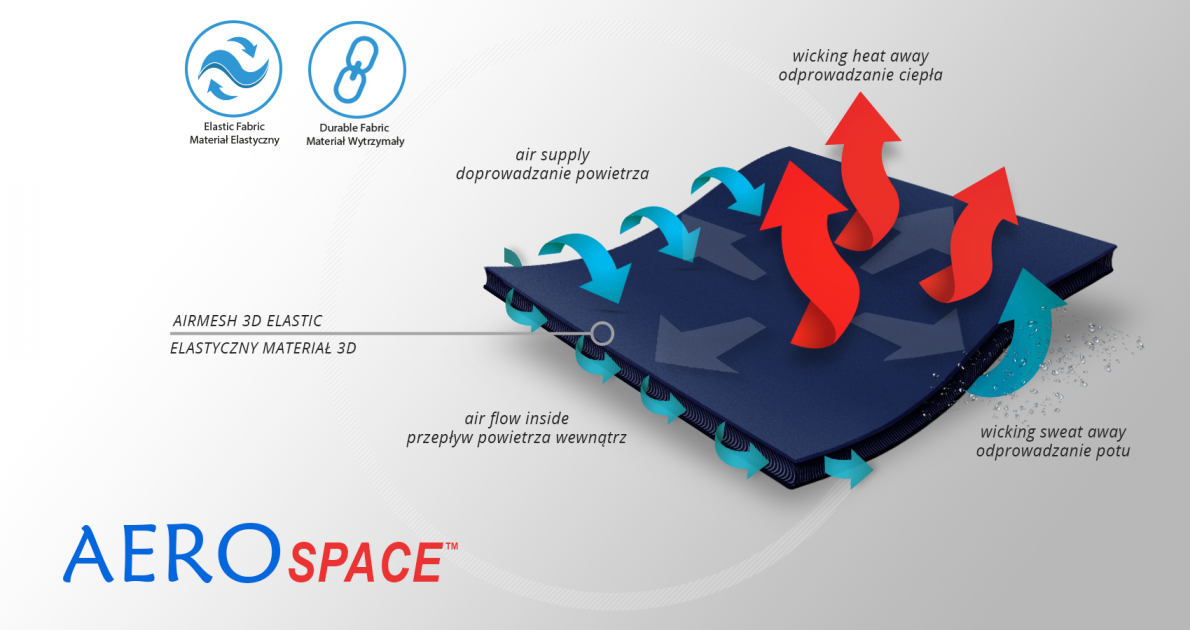 AeroSpace™ is an innovative new generation raw material. It is a distance elastic 3D knitted fabric consisting of two layers of facings and an interlacing that creates the appropriate thickness of the raw material and has relieving properties. The knitwear is made of the highest quality polyester yarn - guaranteeing high mechanical strength and spandex ensuring its proper flexibility. This material is characterized by a very low weight, high flexibility and a very large openwork structure, allowing for very easy drainage of sweat from the body and bringing fresh air to the skin. Products made of this raw material are neutral to the secured joint, do not heat or cool it, but ensure its proper compression and fit and reduce muscle vibrations generated during physical exertion. Its thickness and 3D structure perfectly relieves the orthopedic splints, stays or other elements mounted on the product and guarantees velvety softness to the touch.
