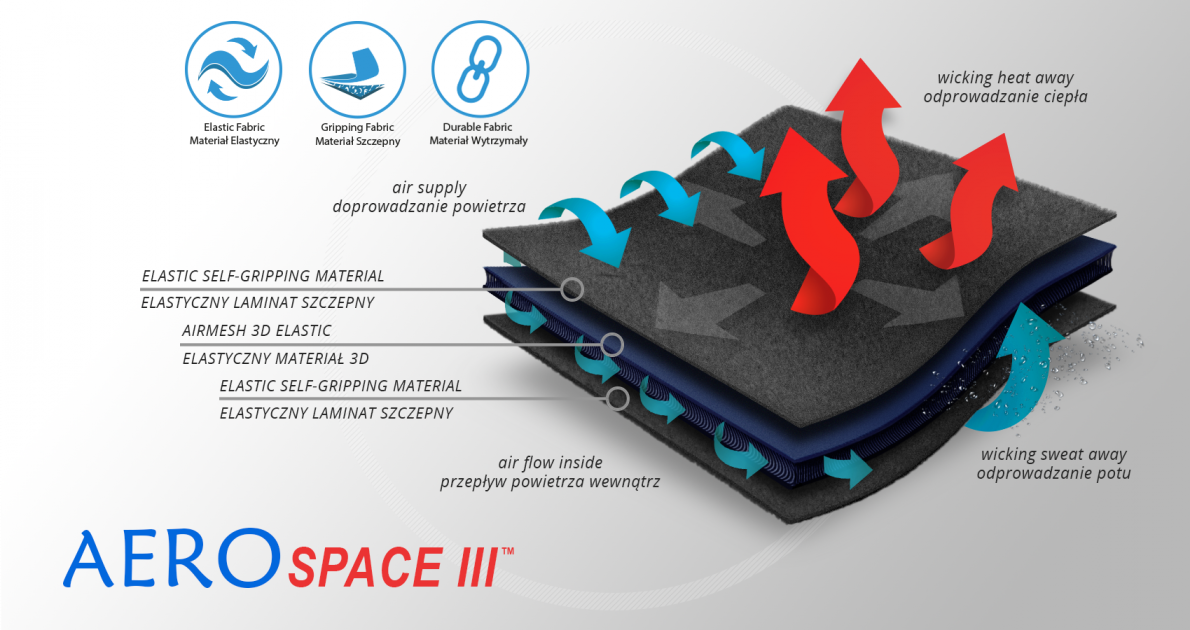 AeroSpace III™ is an innovative new generation raw material. It is a distance elastic 3D knitted fabric consisting of two layers of facings and an interlacing that creates the appropriate thickness of the raw material and has relieving properties. The knitwear is made of the highest quality polyester yarn - guaranteeing high mechanical strength and spandex ensuring its proper flexibility. AeroSpaceIII ™ has an external and internal self-gripping layer what makes it easy to adjust each product to individual patient’s needs. This material is characterized by a very low weight, high flexibility and a very large openwork structure, allowing for very easy drainage of sweat from the body and bringing fresh air to the skin. Products made of this raw material are neutral to the secured joint, do not heat or cool it, but ensure its proper compression and fit and reduce muscle vibrations generated during physical exertion. Its thickness and 3D structure perfectly relieves the orthopedic splints, stays or other elements mounted on the product and guarantees velvety softness to the touch.