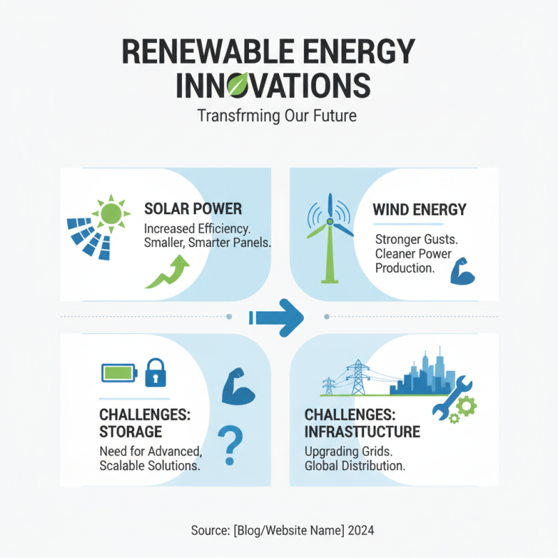 Innovations in renewable energy are transforming our future. Solar panels are becoming more efficient every year. Wind energy technology is harnessing stronger gusts and producing cleaner power. However, challenges remain, including storage and infrastructure.