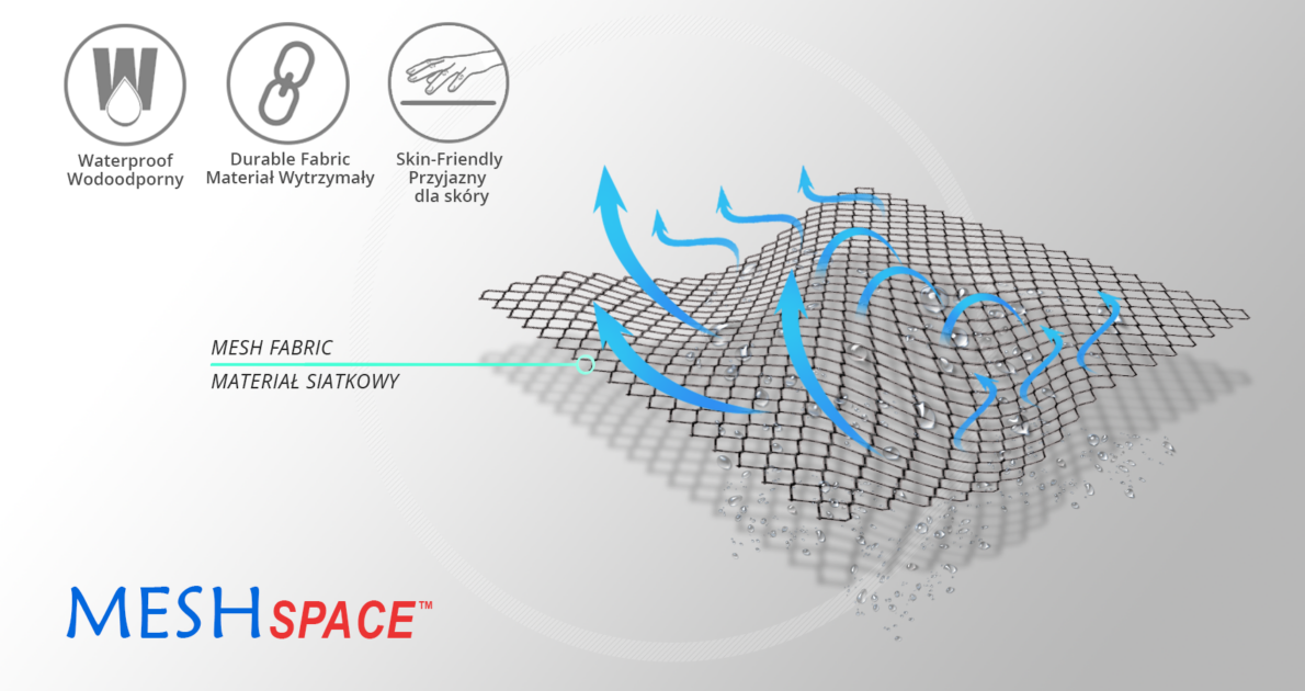 MeshSpace™ is a very strong polyester material that we use in orthopedic products, where high strength of the detail is required, combined with a very small thickness. This raw material is produced by knitting from a very large number of thin, but very strong polyamide yarns. It has an original mesh structure with large openings, which makes it very light, very strong and very airy. An orthopedic device made of this material is neutral for the patient's skin, because no chemicals containing formaldehyde were used during the production of MeshSpace™. In addition, thanks to the fact that the product made of this material has the form of a thin mesh, fresh air successfully reaches the protected limb of the patient and sweat migrates from the skin. The MeshSpace™ material is another example of Reh4Mat's application of the following principle in the production philosophy of its products: Mini Max - minimum product / maximum effect.