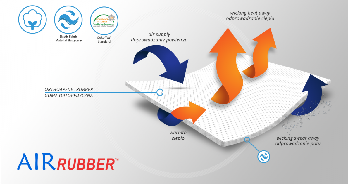 AirRubber™ has unidirectional elasticity and it’s breathable. This lamination is perforated. Between the braids air flows freely and skin can breathe. In addition in high compression, these rubber braids provide a gentle massage for skin. Our orthopedic rubber is very friendly for skin.
