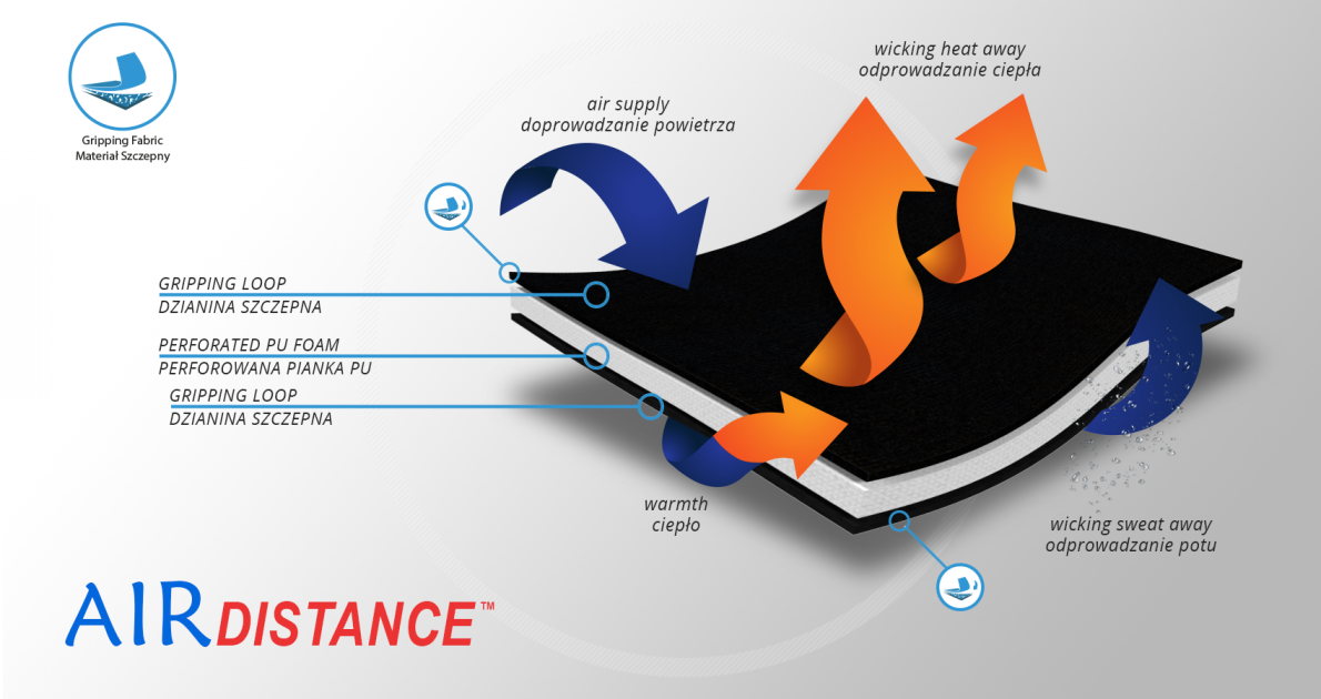 AirDistance™ is an airy 3-layer fabric that consists of perforated comfort foam and 2 durable non-elastic polyamide layers allowing air and water to migrate. This construction makes the skin dry all the time. In addition, the fresh air comes to the skin from outside. AirDistance™ is easy to attach from 2 sides, which allows to fit our braces precisely.