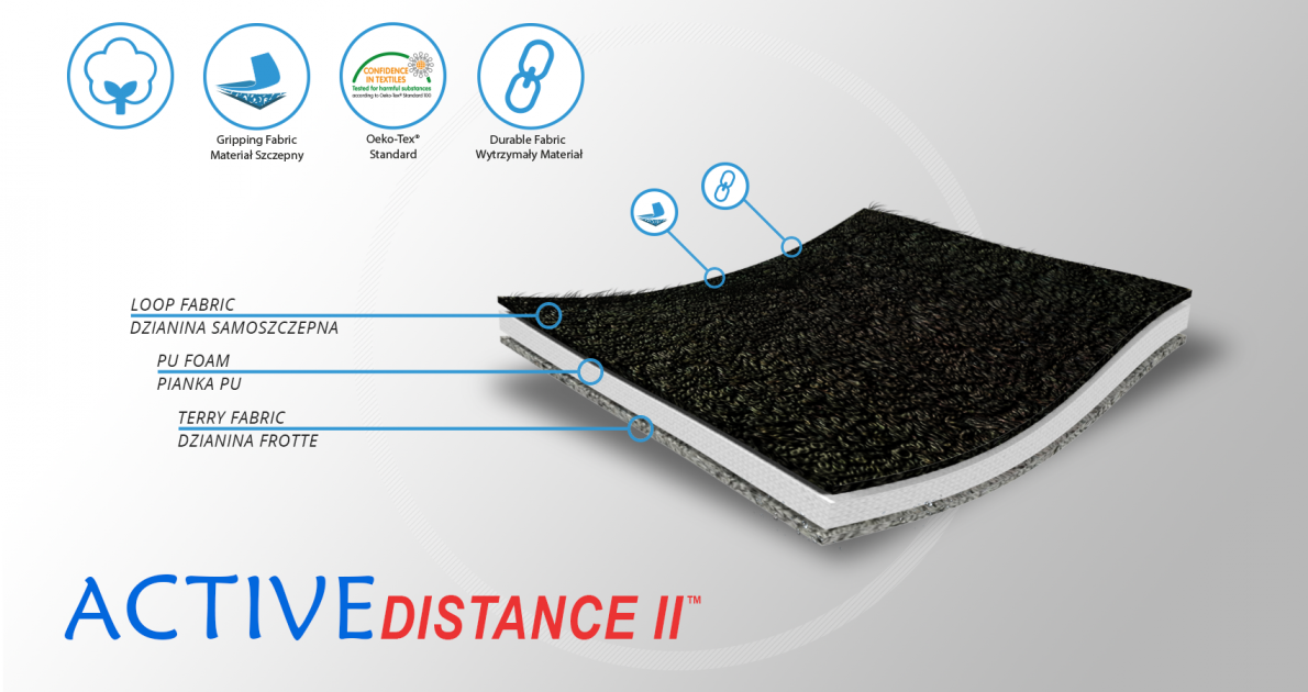 ActiveDistance II™ is an active 3-layered fabric made of non-elastic polyamide self-gripping layer, comfort foam and cotton terry. The last one layer is responsible for maintaining your skin dry. This material is skin-friendly and has the Oeko-Tex Standard 100 certificate. Self-gripping function of ActiveDistance II™ allows to fit the braces precisely.