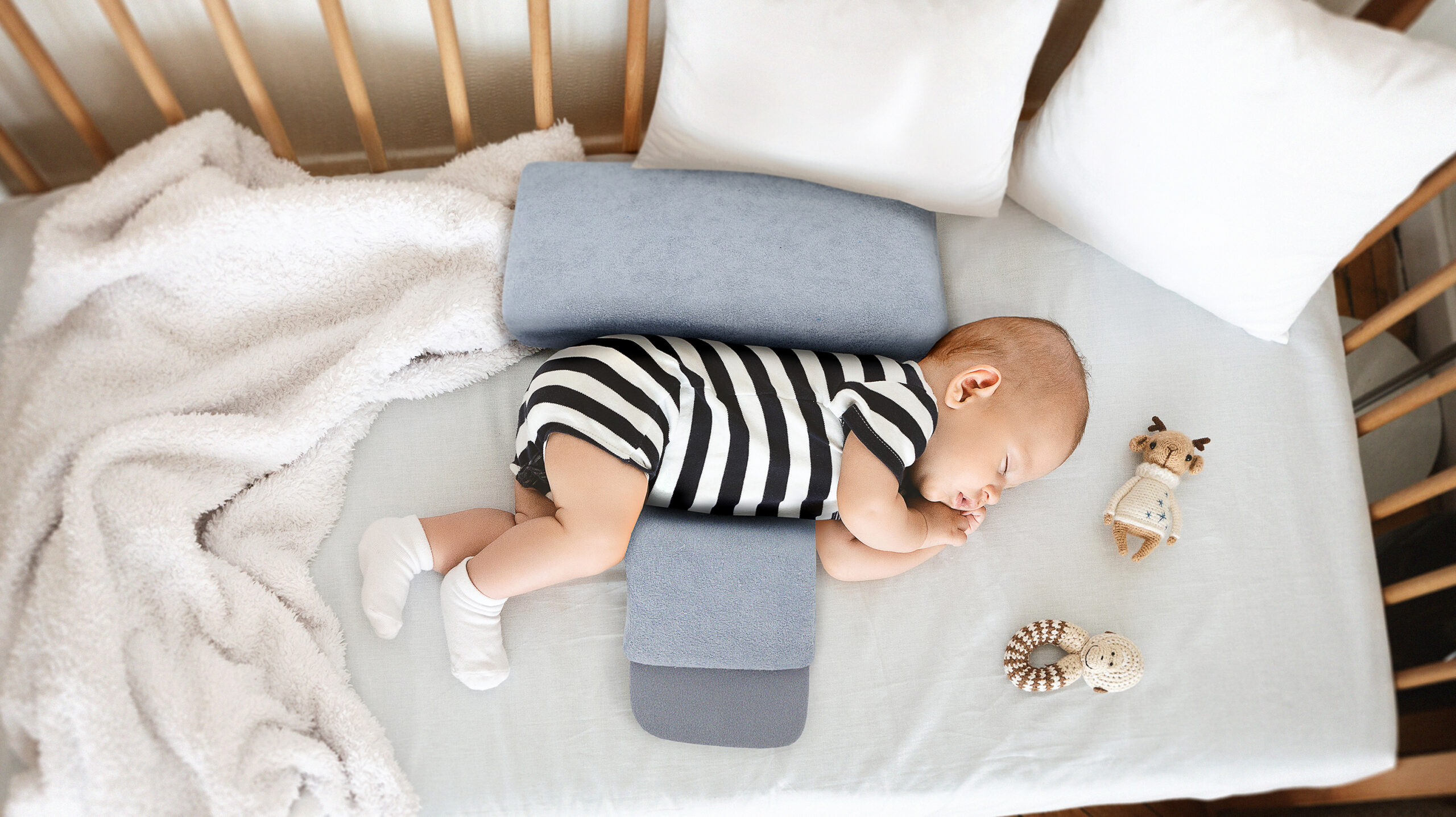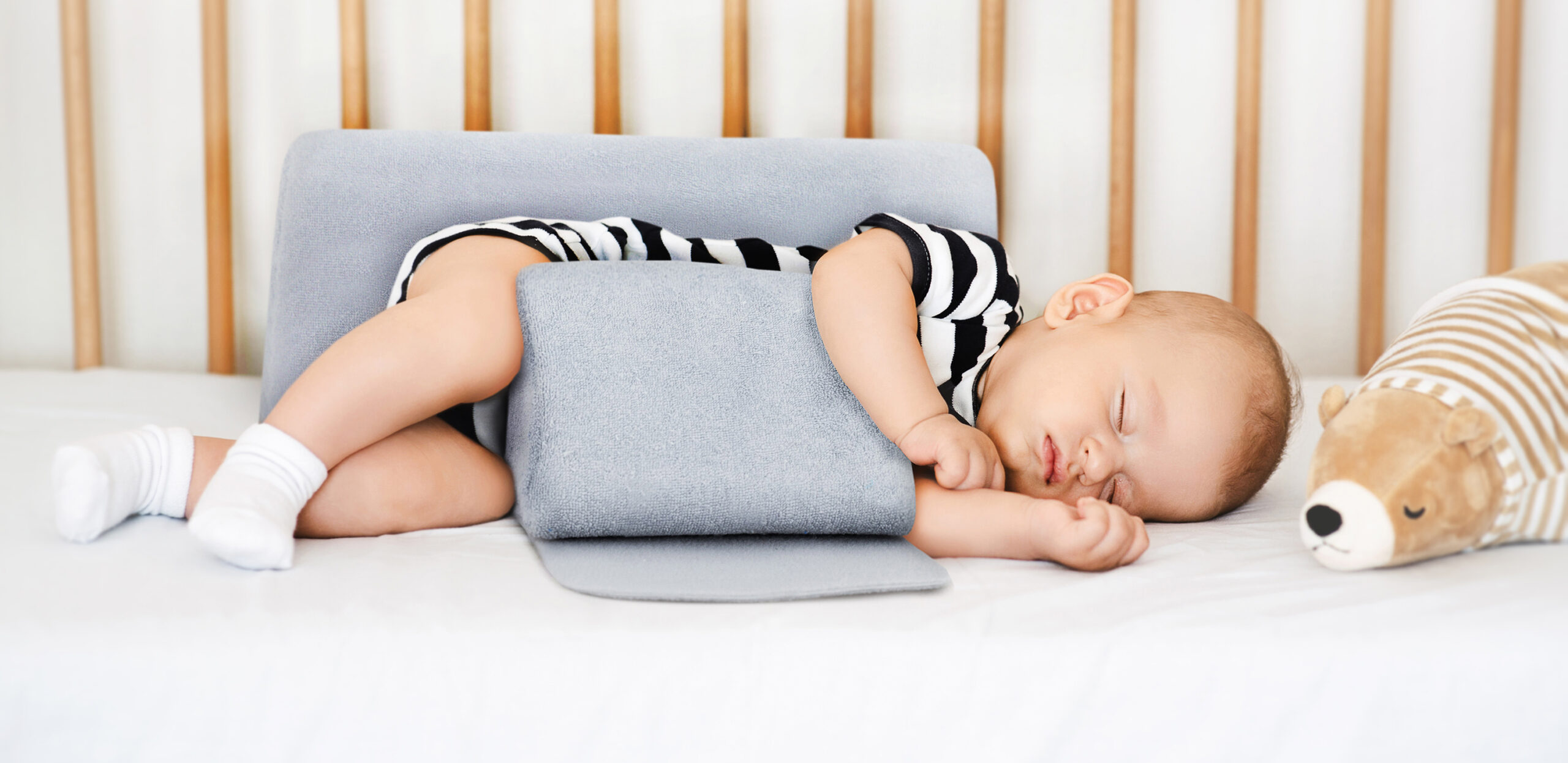 The KLP-01 infant anti roll pillow keeps the baby in a safe, lateral position without the risk of involuntary rolling over onto the stomach and developing SIDS syndrome. In young babies, the muscles controlling the gastric inlet do not yet perform their function perfectly, especially in premature babies. As a consequence of this slight insufficiency, food can back up into the oesophagus and escape from the mouth, which also irritates the airways and provokes swallowing.