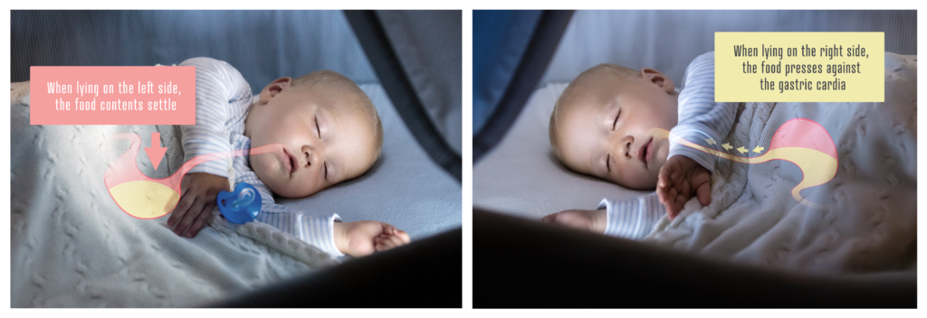 If reflux is not a symptom of a serious illness, it should pass spontaneously by the age of 18 months. Until then, doctors recommend conservative management, i.e. correct feeding and positioning. Studies indicate that placing infants on their left side is effective in reducing reflux. Specialized positioning aids are used for this purpose, i.e. the KLP-01 wedge.