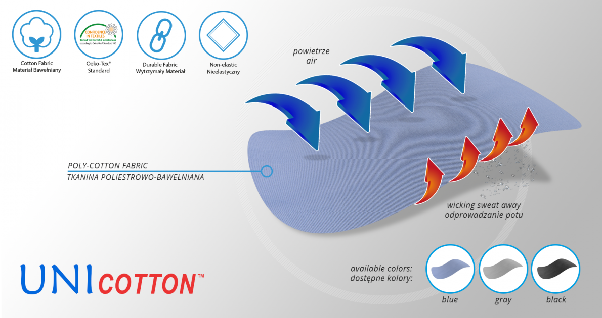 UniCotton™ is a polyester-cotton fabric with versatile use. The fabric is available depending on the needs in different colours and weights, is characterized by high durability and very good performance parameters, it has an Oeko-Tex Standard 100 certificate, which confirms the fact that it is inert to the patient’s skin.
