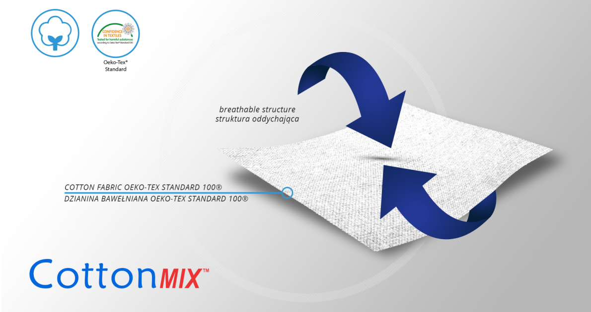 CottonMix™ is an orthopedic, slightly elastic cotton used in our ecological cotton devices. This material is available in different colors and basis weights. All of types of CottonMix™ has Oeko-Tex Standard 100, what means that it is neural for skin.
