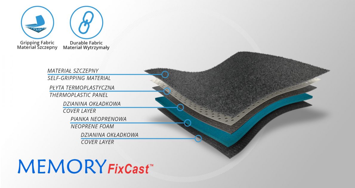 This fabric is made of cover, loop and thin colorful neoprene layer and thermoplastic panel for heat molding. The panel has the same properties as rigid nylon and softens when temperature is approx. 60°C. it’s very easy to do that, there is enough to place the brace is boiling water or microvawe. Our thermoplastic panel is safe and biodegradable. Contrary to ordinary plaster cast, high plasticity of MEMORYFixCast™ allows to heat and mold it many times according to doctor’s recommendations.