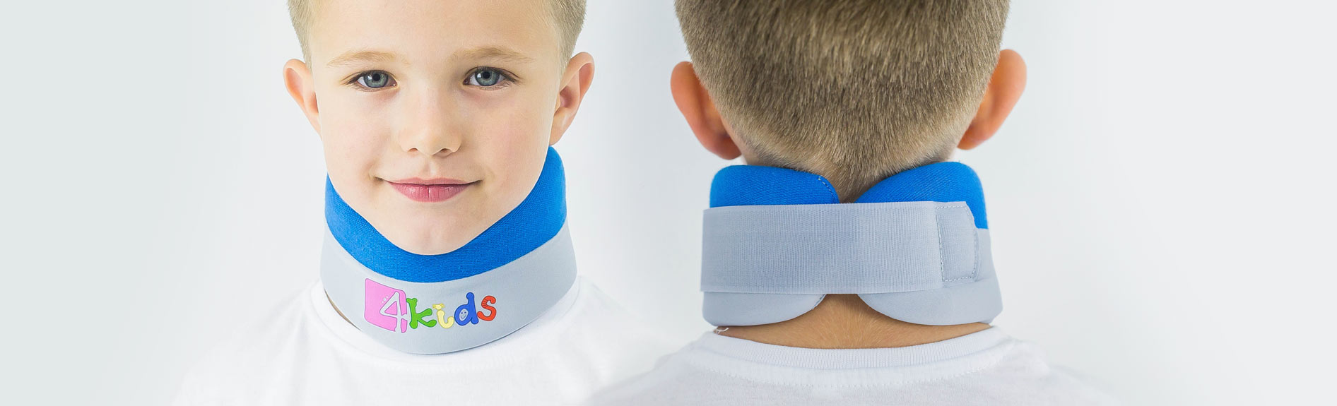 The internal part of the collar, on which jawbone is placed, is made of soft foam that provides offloading and stabilization of intervertebral discs and neck muscles. The external part of the product is covered by 2 kinds of fabrics. The grey lycra has a smooth construction. Thanks to that, no additional material that can cause discomfort. The upper part of the collar EB-KM is made of a blue cotton that provides ventilation to skin. This material is extremely soft and velvet. As a result, a child can feel the high comfort while using our product.