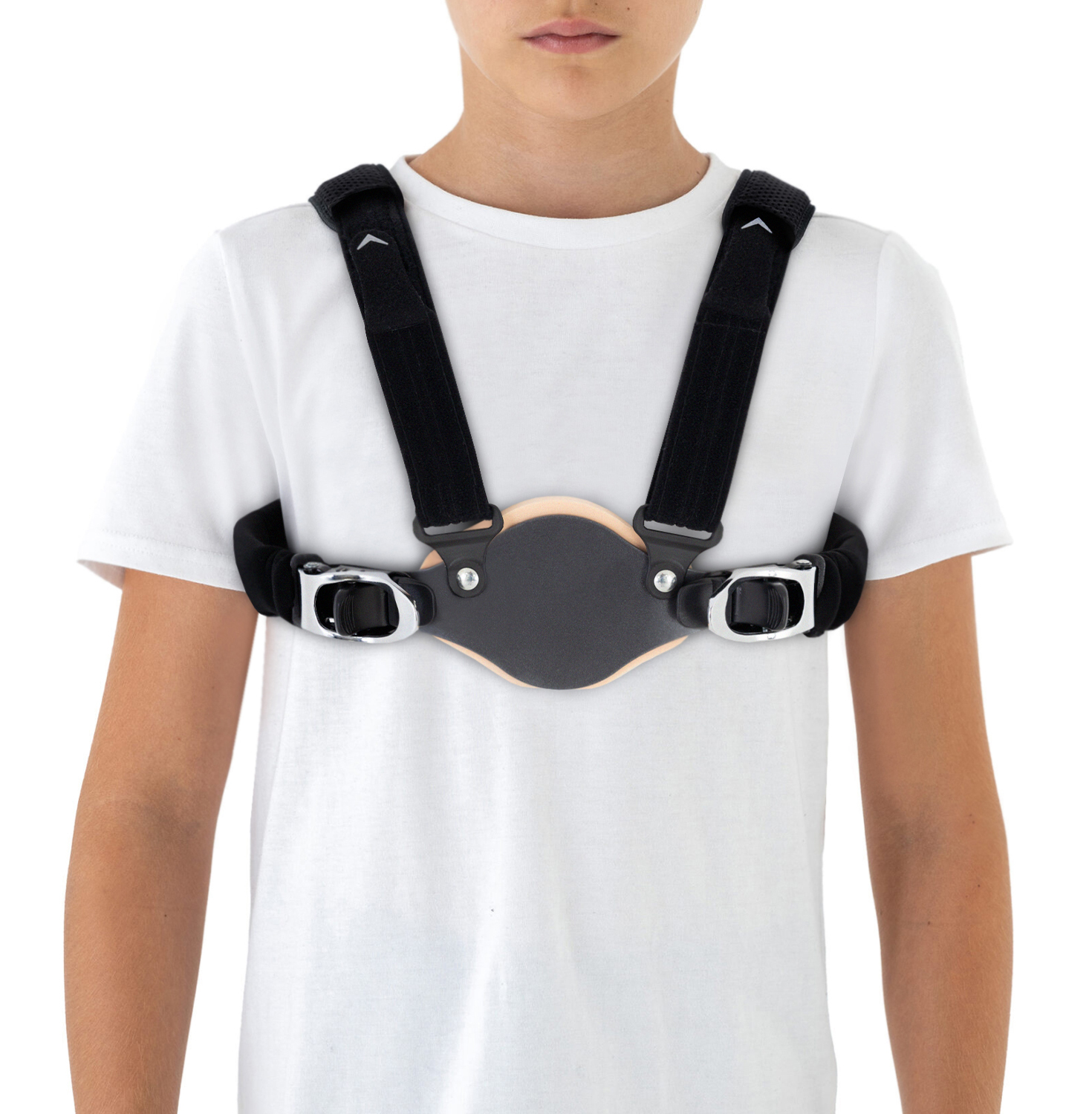 The frame is made of lightweight high quality aluminum 6061 T6, which is used in aeronautics guarantees the best stabilization in the market. Under the frame there is special medical foam providing comfort for bony prominences. Our pectus carinatum brace should be applied during adolescence, prior to skeletal maturity, when bones are able to shape. Because of innovative system CALIPER BUCKLE, our CARINATUM brace provides an anterior and posterior compression (AP), which over time, remodels the bones and cartilages and replaces them to physiological position.