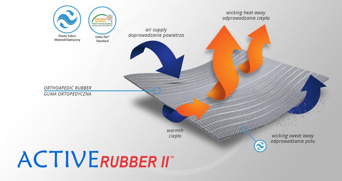 ActiveRubber II™ is strong and bidirectional elasticity. It can be stretched, increasing the length and width, what improves compression. Between the braids air flows freely and skin can breathe. In addition in high compression, these rubber braids provide a gentle massage for skin. Our orthopedic rubber is very friendly for skin.